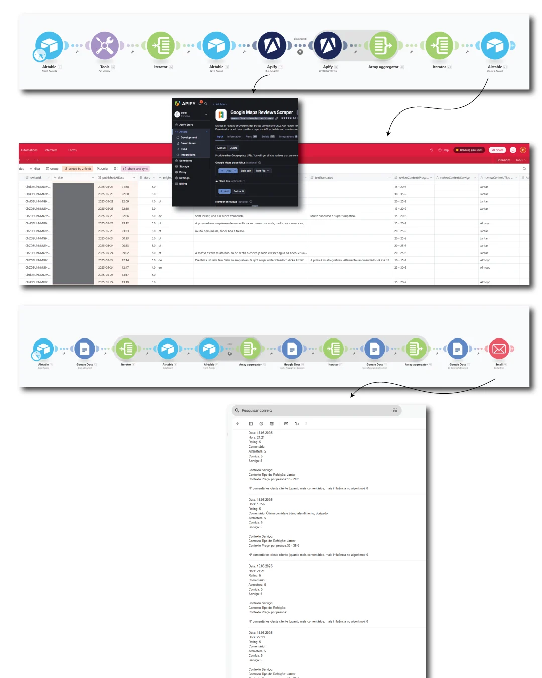 Liga ao Airtable para saber que restaurantes deve analisar. De seguida faz uma chamada ao Apify, onde recolhe as respectivas avaliações Google das últimas 24 horas, levando toda informação de volta ao Airtable.